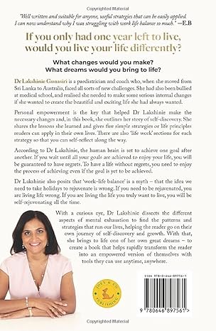 Dr Lakshinie also posits that ‘work–life balance’ is a myth – that the idea we need to take holidays to rejuvenate is wrong. If you need to be rejuvenated, you are living life wrong. If you are living the life you truly want to live, you will be self-rejuvenating all the time.